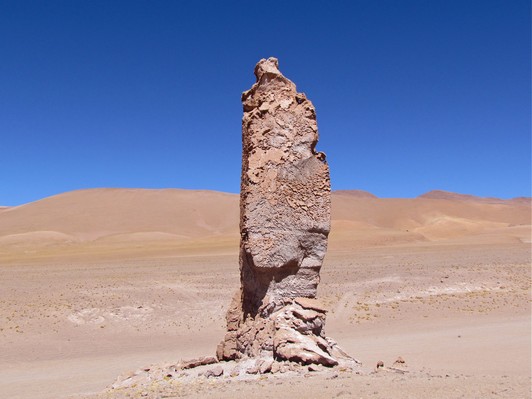 Planté en plein désert, un rocher haut de 27 m au profil d’indien semble garder les lieux. Dès lors, la route fait place à une piste sablonneuse qui débouche sur un vaste plateau désertique bordé de falaises ciselées composées d’agglomérat de cendres volcaniques et sur lequel se sont répandues des coulées de basalte et d’obsidienne. A l’horizon se dresse à 5653 m d’altitude le volcan Zapaleri dont le sommet constitue le tripoint entre les frontières de l’Argentine, de la Bolivie et du Chili. Plus près, au fond d’une dépression, le salar de Tara s’offre à nous. Un panorama à couper le souffle. Avec tous ces flamants roses et ces dizaines d’espèces d’oiseaux à observer, c’est vraiment l’Altiplano dans toute sa splendeur ! Mais ce n’est pas ce soir que nous allons faire la fiesta « Chez Carmen », petit resto très sympa à San Pedro. Pas de Casillero del Diablo non plus pour arroser cette merveilleuse journée … et comble de tout, il faut aller au lit de bonne heure ! Car demain l’ascension du Lascar nous attend et ce n’est pas tous les jours que l’on grimpe à 5592 m sur l’un des volcans les plus actifs du Chili. Il a connu plus de 30 éruptions depuis les années 1850 ; la plus violente projeta des cendres jusqu’à Buenos Aires et la dernière date de 2007. A ses pieds, tel un miroir, la laguna Lejia renvoie l’extraordinaire image d’un autre volcan, le Chiliques pendant que sur ses berges quelques nandous, espèce d’oiseaux voisins de l’autruche, déguerpissent à grandes enjambées. La pente du Lascar est abrupte et au travers d’éboulis de roches et de cendres, la progression est difficile. Des émanations de soufre, la raréfaction d’oxygène et certainement le manque de préparation nous handicapent énormément. Le souffle se fait de plus en plus court, mais après plusieurs heures nous atteignons le sommet, heureux mais complètement exténués. Depuis la crête, la vue sur le cratère éventré d’où s’échappent des fumeroles est impressionnante : nous sommes bien sur une gigantesque bombe à retardement …