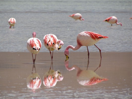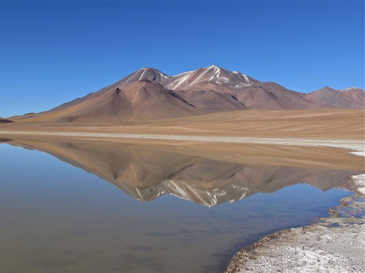 A 4800 m, même en région désertique, la nuit a été fraîche et une fine pellicule de glace recouvre la laguna Quepiapo dominée par le célèbre Licancabur, le volcan au cône parfait de 5916 m qui fait rêver tous les vulcanologues et que nous avons prévu de gravir lorsque nous serons mieux acclimatés à l’altitude. Encore plus haut, le volcan Pili reflète son sommet déchiqueté (6046 m) dans la laguna Diamantes d’un bleu aussi pur que celui du ciel andin. Quelques lamas et vigognes complètent la scène : l’image est féérique ! Au loin, vue de la caldera de la Pakana, une étendue émeraude surgit au milieu de ce paysage aride : c’est la laguna Aguas Calientes. Tous ces lacs d’altitude, plus ou moins profonds, ponctuent le désert de leurs eaux multicolores et font le bonheur des flamants roses qui viennent s’y délecter des minuscules crevettes qu’ils renferment.