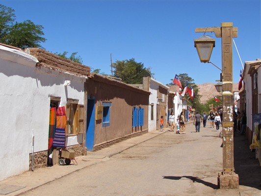 Isolé en plein désert, au pied du majestueux volcan Licancabur au cône parfait de 5916 mètres de haut, San Pedro de Atacama est considéré comme la capitale archéologique du Chili. Ce gros bourg de 7500 habitants construit à 2438 mètres d’altitude est situé 1300 km au nord de Santiago. Il s’étire le long d’une rue principale en terre battue et c’est également le point de départ idéal pour découvrir la beauté sauvage des paysages qui l’entourent. L’Airbus de la LAN qui permet d’y accéder, via Calama (où l’on trouve la plus grande mine à ciel ouvert de cuivre au monde), survole la Cordillère des Andes aux pentes enneigées puis arides plus nous nous rapprochons du désert d’Atacama, que nous allons parcourir durant plusieurs jours.