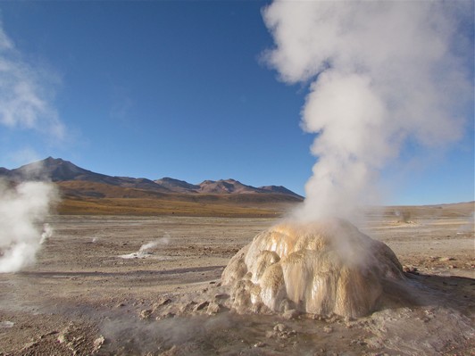 Situé à 4321 m d’altitude et d’une surface de plus de 30 km2, El Tatio est la troisième plus grande zone géothermale au monde après celle de Yellowstone aux Etats-Unis et celle de la Vallée des Geysers en Russie. L’eau provenant de la fonte des neiges et qui s’est infiltrée dans des failles à environ 800 mètres de profondeur, là où la température atteint les 250°, est réchauffée puis se transforme en vapeur avant d’être expulsée vers la surface. Ainsi, plusieurs dizaines de fumerolles et de solfatares, des terrasses de geysérite, plus d’une centaine de sources chaudes (dont 80 geysers) et quelques volcans de boue parsèment le secteur. Et même si la hauteur des geysers n’est pas très importante, le spectacle est grandiose, surtout au lever du jour quand le contraste entre la température ambiante glaciale et celle de l’eau en ébullition est au maximum. C’est aussi à ce moment-là qu’apparaissent les viscaches, gros rongeurs proches du lapin mais avec une queue touffue ressemblant à celle de l’écureuil, peu effarouchées par notre présence. Mais nous n’aurons guère le loisir de les observer quand elles bondissent de rocher en rocher ou prennent la pause sous les premiers rayons bienfaiteurs du soleil. Car demain dimanche, la Bolivie vote pour élire son nouveau Président et les frontières seront fermées. Pour cela nous devons abréger notre séjour au Chili pour pouvoir poursuivre notre aventure…