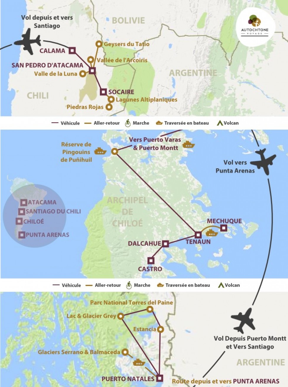 Majoritairement proposé en 14 jours chez nos confrères du voyage, ce circuit propose les incontournables du Chili sans jamais faire l’impasse sur la culture autochtone. Sur fond de Torres del Paine, Désert d’Atacama et de Chiloé, agrémentés de petites pépites aux couleurs locales, vous découvrez les merveilles de la nature chilienne MAIS aussi de son peuple lors de rencontres et de nuits chez l’habitant.