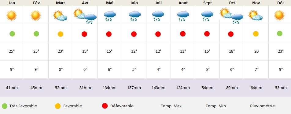D’avril à novembre le climat est très humide (9°C à 19°C).