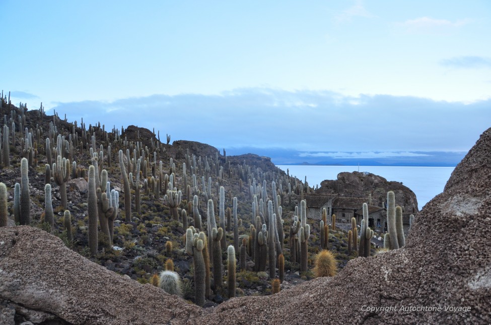 Désert d’Uyuni, le plus vaste désert de sel au monde, son blanc immaculé, ne semble pas offrir d’horizon, au point de se demander où nous conduit ce périple. C’est alors que se dévoile sous vos yeux ; l’Isla Incuahuasi, une ile d’origine volcanique recouverte d’une centaine de cactus. Vous posez pieds sur l’ile (entourée d’eau pendant la saison des pluies, la rendant alors inaccessible) afin d’y effectuer une courte promenade.
