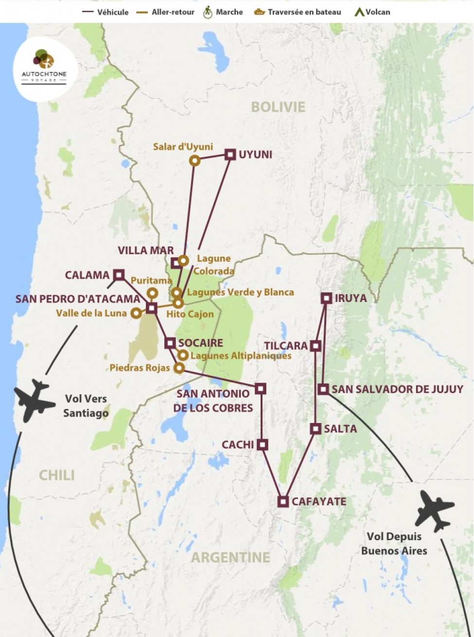 Les parures andines chamarrées, le ciel bleu, les lagunes turquoise, les roches minérales et les dégradés de vert des oasis sont autant de teintes et de nuances qui magnifient et pimentent ces paysages étonnants. Le sol, dépourvu de végétation, s’étale comme pour mieux exposer à nos regards la formation de ses créations millénaires : salars, volcans, cordillères et canyons.