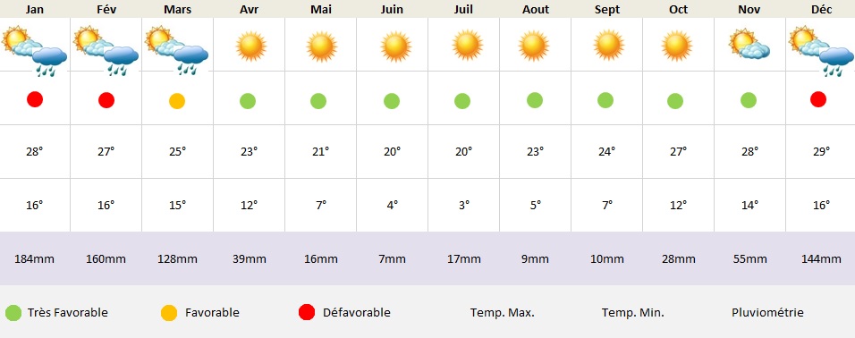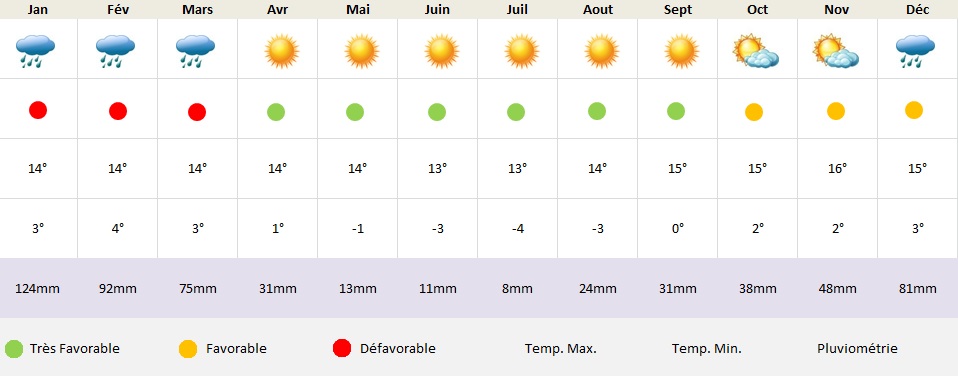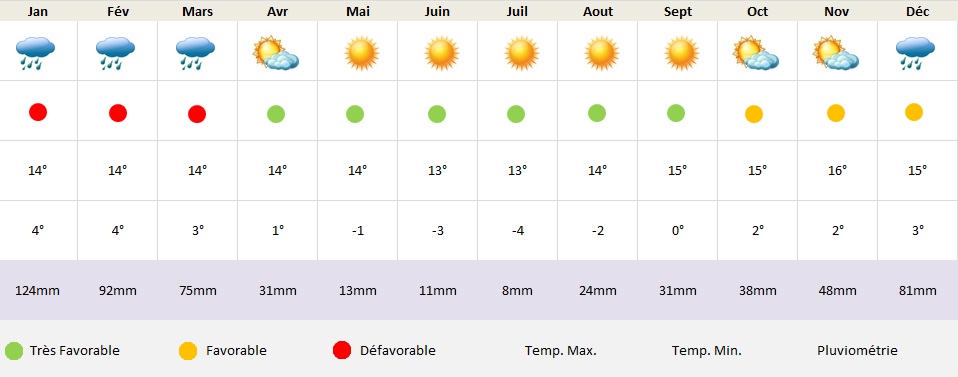 La saison la plus favorable se situe entre avril et octobre bien que les mois de juin, juillet et août soient aussi les plus froids.