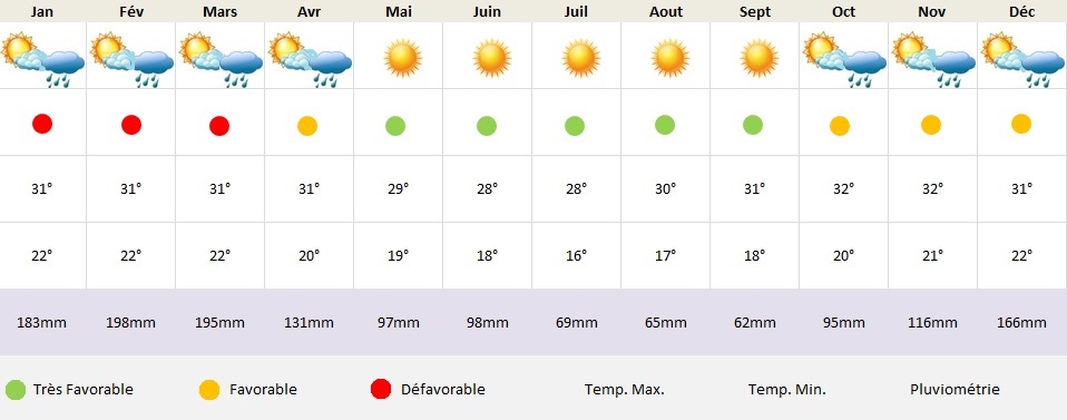 Les mois d’avril à octobre correspondent à la saison sèche et la chaleur dans la journée est alors moins étouffante. A noter, la faible amplitude thermique entre le jour et la nuit.