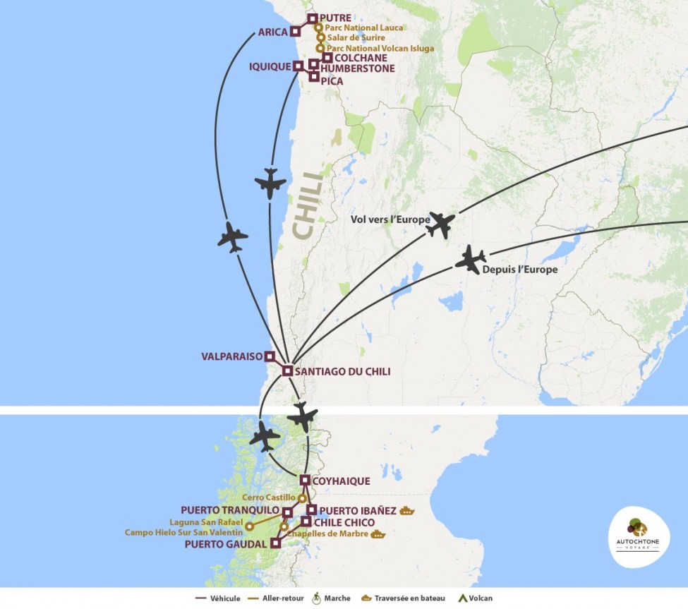 Départ d’Europe et vol international de nuit en direction du Chili.