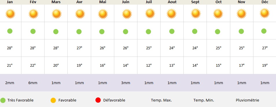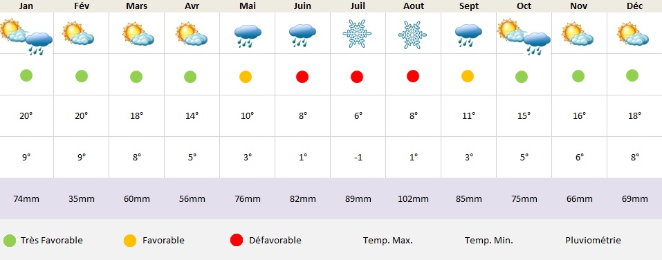 Côté températures, le mercure atteint 16°C au maximum en hiver et 25°C en été.